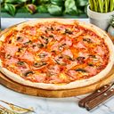Pizza med tomatsaus, mozzarella, pepperoni Napoli, pancetta, skinke og oregano.