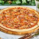 Pizza med tomatsaus, mozzarella, biff, pancetta, sjampinjong, løk og oregano.