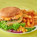 Cheeseburger med salat, agurk, løk, mais, dressing og pommes frites. Velg antall gram.