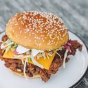 Fried chicken or Nashville-hot burger. Served in a sesame bun with aged cheddar, aioli, rantziki, DSD sauce, slaw and pickled red onion.