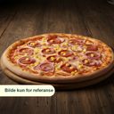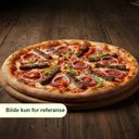 Pizza med biff, pepperoni, bacon, løk, paprika på tomatsaus og ost.