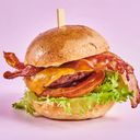 Kvernet høyrygg av storfe, bacon, cheddar, salat, rødløk, tomat og aioli.