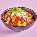 Kvernet høyrygg av storfe, feta, nacho chips, salsa fresca, guacamole og chipotlemayo.