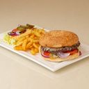 Middagstallerken med hamburger i brød med ost, salat, tomat, agurk, løk, dressing og pommes frites.