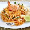 Wokstekt risnudler med kylling, scampi, tofu, egg og grønnsaker i Pad Thai saus.