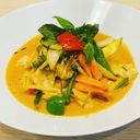 Tofu med grønnsaker i Panang karri av kokosmelk. Serveres med ris.