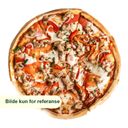 Pizza med kebabkjøtt, paprika, champignon og løk.