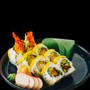 8 biter: tempura scampi med agurk og avokado. Toppes med mango 8 biter: tempura scampi med agurk, avokado