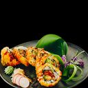 Salad mix, cucumber, avokado, salmon, crabstick and tempura scampi. Topped with chili mayo, teriakyi and ponzo sauce.