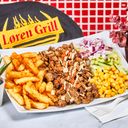 Kebabkjøtt servert med salat, mais, agurk, løk, valgfri kebabdressing og pommes frites.