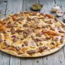 Pizza med tomatsaus, ost, marinert biffkjøtt, sprøstekt løk, bacon, fersk champignon og fersk paprika.
