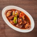 Fritert scampi med paprika, purreløk og hvitløk-chilisaus.