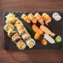 4 biter mango maki, 4 biter tempura maki, 4 biter flambert laks maki, 4 biter kimchi biff maki og 4 biter nigiri.