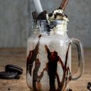 Oreo-shake. Toppet med krem, sjokoladekjeks , oreostrø og oreokjeks. Allergener: melk, hvetegluten, soya, nøtter