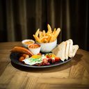 Kyllingburger med chipotleaioli og syltet rødløk. Toppet med salat og hvitløksdressing. Serveres med løkringer.