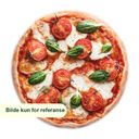 Pizza med tomatsaus, mozzarella, cherrytomat og pesto. Toppes med fersk basilikum.