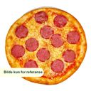 Pizza med tomatsaus, mozzarella, pepperoni, salami og løk.
