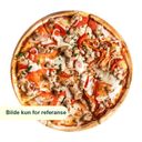 Pizza med tomatsaus, mozzarella, pepperoni, kylling, champignon og løk.