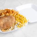 Kyllingburger, serveres med pommes frites, salat og dressing.