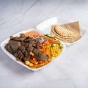Stor kebabtellerken. Serveres med pommes frites, salat og dressing.