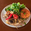 Godt krydret kjøtt av lammebog. Her er det mye mat, og pass opp - dette er sterke saker! Serveres med salat, pitabrød og bulgur (hvete).