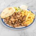 Miks av kyllingkebab, biff og kebabkjøtt med salat, mais, agurk, tomat, løk og kebabdressing. Serveres med pommes frites. Velg mellom liten eller stor.