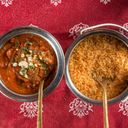 Lam tilberedt i tykk curry saus med ingefær og hvitløk. Serveres med ris.