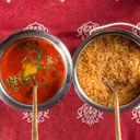 Mung og rød split linse med korinder, kumin, hvitløk, tomat og løk. Serveres med ris.
