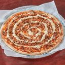 Pizza med tomatsaus, ost, biff, pepperoni, bacon og løk.