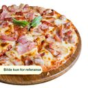 Pizza med tomatsaus, ost, bacon, champignon og purreløk. Stor pizza kan ikke lages glutenfri.