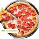 Pizza med tomatsaus, ost, pepperoni og ananas. Stor pizza kan ikke lages glutenfri.