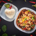 Okse, kylling eller svin med grønnsaker i en chopsuey-saus. Serveres med ris.