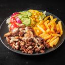 Kyllingkebabtallerken med assorterte grønnsaker, pommes frites og dressing.