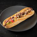 Baguette med kebabkjøtt, utvalgte grønnsaker, ost, pommes frites og dressing.