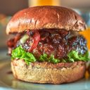 Storfeburger med saus av cheddar, parmesan og jalapeno, BBQ-glasert bacon, stekt rødløk, salat og majones.