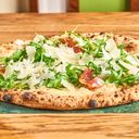 Fersk mozzarella, trøffelkrem, stekt parmaskinke, ruccola og parmesan.