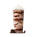 Softis, melk, knust sjokolade, sjokoladesaus og pisket krem. 0,6 kg CO2e