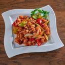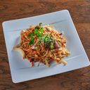 Tradisjonell nudler med kjøttdeig og grønnsaker i Sichuan-stil. Krydret med chili.