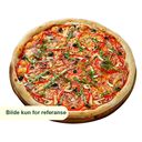 Pizza med tomatsaus, ost, skinke, pepperoni og bacon. Velg størrelse.