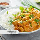 Lam, kylling og kongereker kokt med ris og biryani krydder. serveres med biryanisaus.