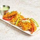 Møre strimler av krydret kylling frityrstekt til sprø gyllenbrun perfeksjon. Serveres med en kald myntechutney.