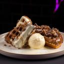 Varm vaffel med smuldret brownie og toppet med smeltet belgisk hvit sjokolade. Serves med vaniljeis.