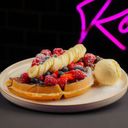 Varm vaffel toppet med jordbær og banan. Toppet med smeltet belgisk hvit sjokolade. Serveres med vaniljeis.