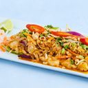 Stekte risnudler i tamarindsaus med egg, grønnsaker, bønnespirer, peanøtter og lime. Velg mellom kylling eller scampi.