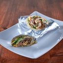 Kebab i pita med salat, løk, mais, dressing, hvitløksdressing og kebabsaus. Velg kjøtt.