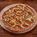 Pizza med tomatsaus, ost, marinert kylling, pesto, chili og ferske tomater.