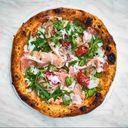Serving sized pizza with San Marzano Tomato, San Daniele Ham, Casbar Cheese Mix, Rucola Pesto, Roasted Pine Nut