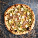 Serving sized pizza with Røros Sour Cream, Italian Bacon, Truffle Mayo, Cured Egg Yolk & Black Pepper