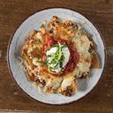 Nacho chips toppet med krydret kjøttdeig, og gratinert ost. Serveres med salsa, rømme og purreløk.