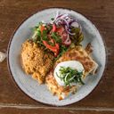 Hvetetortilla med strimlet marinert kyllingbryst, chillibønner og salsa. Gratinert med ost, serveres med kornris, salat, rømme, purreløk.